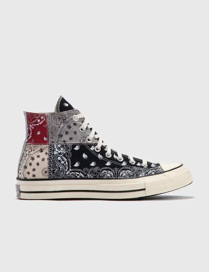 Ajoutez une touche d'audace et de style à votre collection avec cette paire unique de Converse Chuck 70 High, réimaginée dans un design patchwork inspiré du motif bandana. Avec ses détails multicouleurs, cette sneaker combine des nuances de noir, de gris, de rouge et de beige pour un look authentique et branché.
