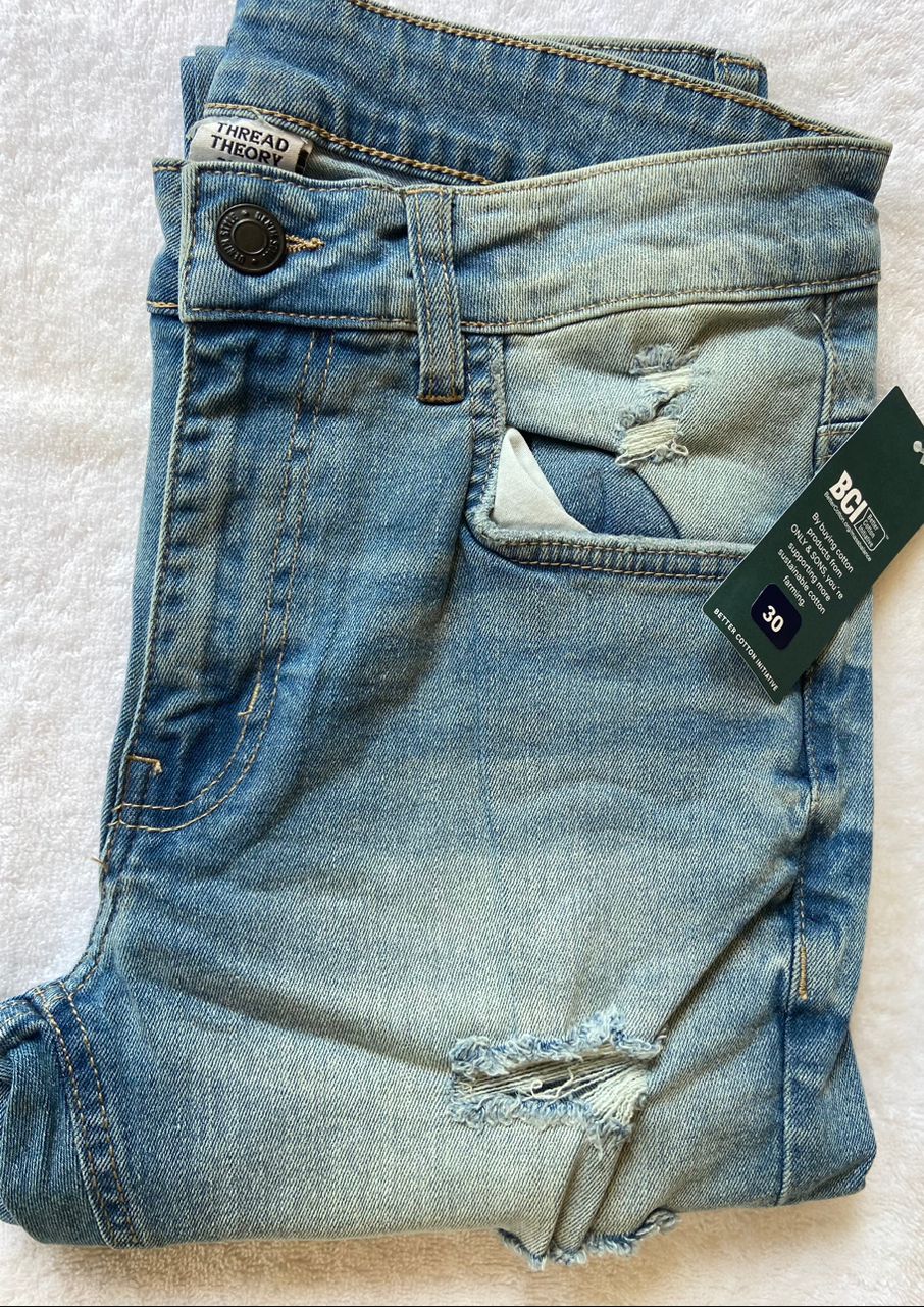 - Style décontracté et tendance avec des déchirures et des effilochages visibles