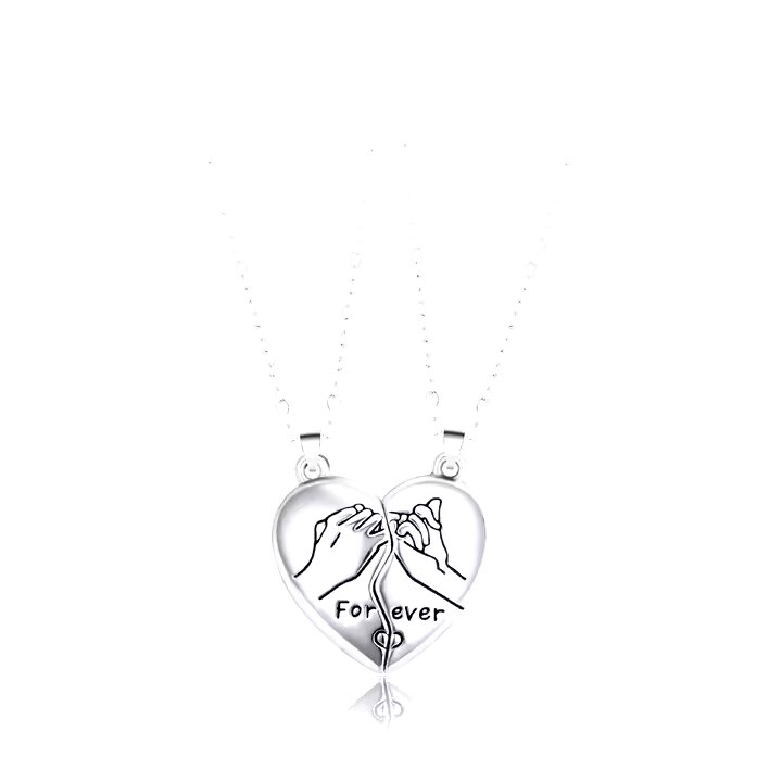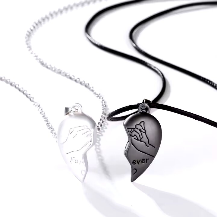 Exprimez votre amour unique avec ce pendentif duo en forme de cœur, parfait pour les couples. Ce bijou se divise en deux parties, chaque moitié ayant une chaîne séparée, symbolisant le lien entre deux âmes. Gravé avec un design élégant montrant deux mains entrelacées, il représente l'unité et la promesse de rester connectés, même à distance. Fabriqué dans un métal de haute qualité, ce pendentif est à la fois résistant et élégant, idéal pour un usage quotidien. Offrez-le à votre moitié et portez-le ensemble pour rappeler la force de votre amour, où que vous soyez.