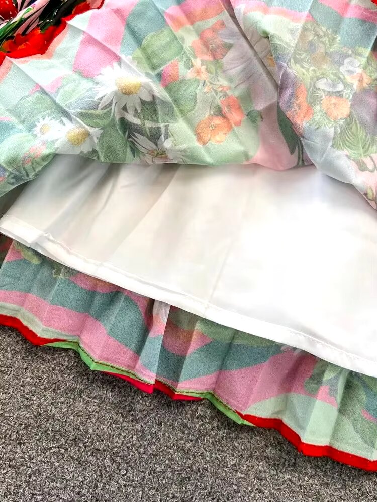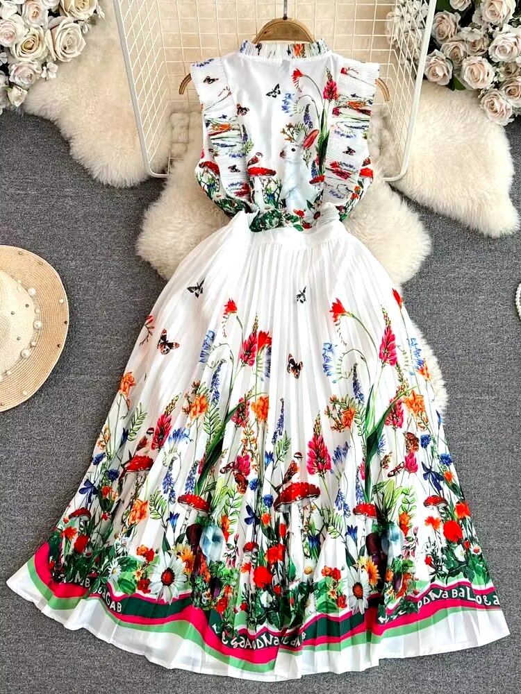 Élégante et raffinée, cette robe plissée sans manches est un incontournable pour un look estival chic. Ornée d'un magnifique imprimé floral vif, de papillons et d'un adorable motif de lapin, cette robe apporte une touche de fantaisie et de fraîcheur. Les volants sur les manches et l'encolure ajoutent une note féminine et romantique, parfaite pour une journée ensoleillée ou une soirée au bord de la mer.