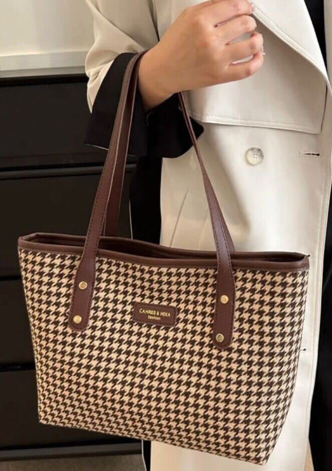 Apportez une touche de sophistication à votre tenue avec ce sac à main au motif classique pied-de-poule. Parfait pour les journées chargées ou vos sorties, il offre une combinaison de style et de praticité. Avec ses poignées en cuir marron foncé renforcées par des rivets dorés, ce sac est à la fois durable et chic. Le logo en relief « CANRES & HEKA Fashion » ajoute une touche raffinée à l’ensemble.